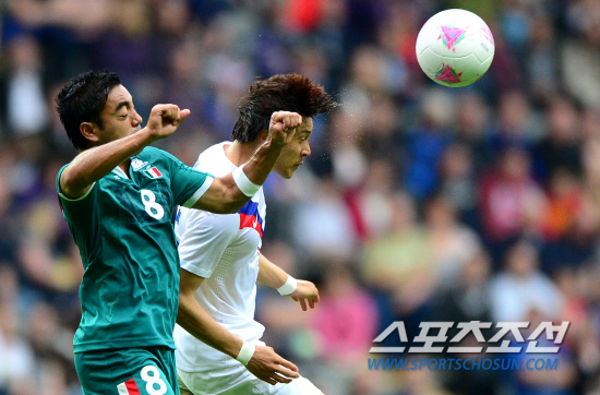 대한민국이 26일 오후 영국 뉴캐슬 세인트제임스파크 스타디움에서 멕시코를 상대로 런던올림픽 남자축구 B조 1차전을 펼쳤다. 박종우가 멕시코 파비안과 공중볼 경함을 벌이고 있다.