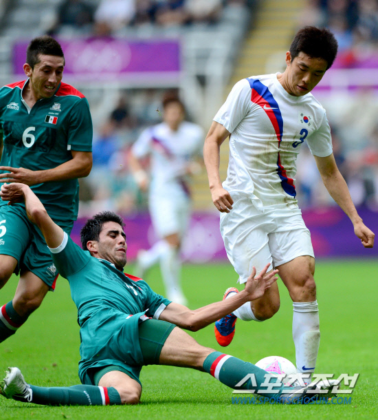대한민국이 26일 오후 영국 뉴캐슬 세인트제임스파크 스타디움에서 멕시코를 상대로 런던올림픽 남자축구 B조 1차전을 펼쳤다. 윤석영이 멕시코 수비수의 태클을 피해 돌파를 시도하고 있다.