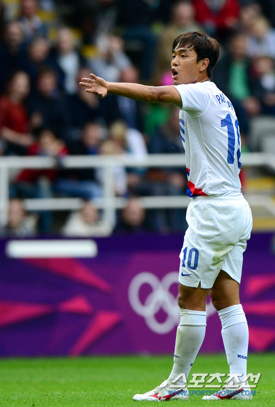 대한민국이 26일 오후 영국 뉴캐슬 세인트제임스파크 스타디움에서 멕시코를 상대로 런던올림픽 남자축구 B조 1차전을 펼쳤다. 전반 프리킥 상황에서 박주영이 동료들의 위치를 정해주고 있다.