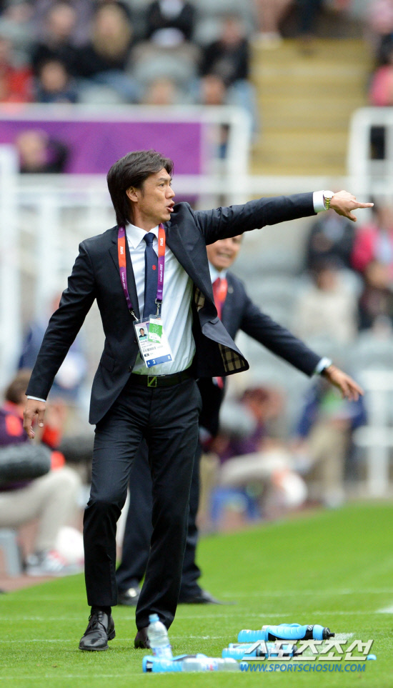 2012 런던올림픽 축구대표팀의 홍명보 감독이 26일(현지시간) 뉴캐슬의 세인트 제임스 파크 스타디움에서 열린 멕시코전에서 작전을 지시하고 있다.