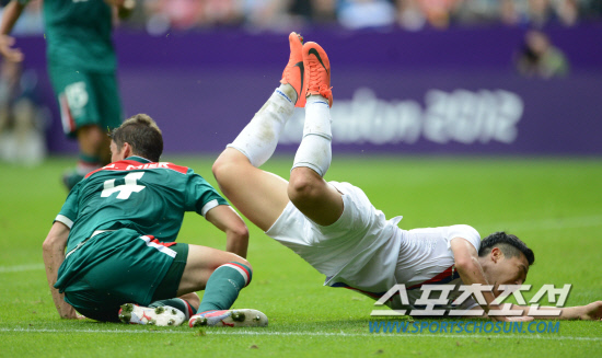 2012 런던올림픽 축구대표팀의 남태희가 26일(현지시간) 뉴캐슬의 세인트 제임스 파크 스타디움에서 열린 멕시코전에서 슛을 노리다가 MIER Hiram의 발에 걸려 넘어지고 있다.