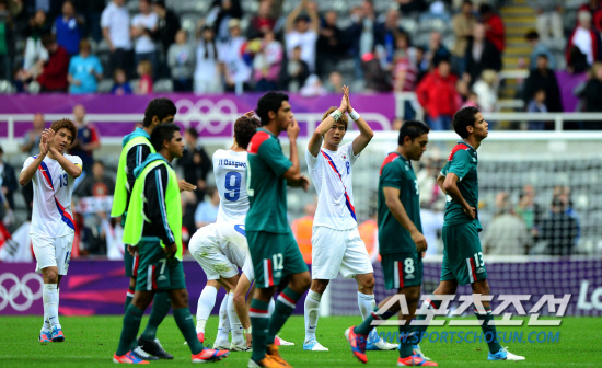 대한민국이 26일 오후 영국 뉴캐슬 세인트제임스파크 스타디움에서 멕시코를 상대로 런던올림픽 남자축구 B조 1차전을 펼쳤다. 멕시코와 0대0 무승부를 기록했다. 경기 종료 후 관중들에게 인사를 하고 있는 선수들.