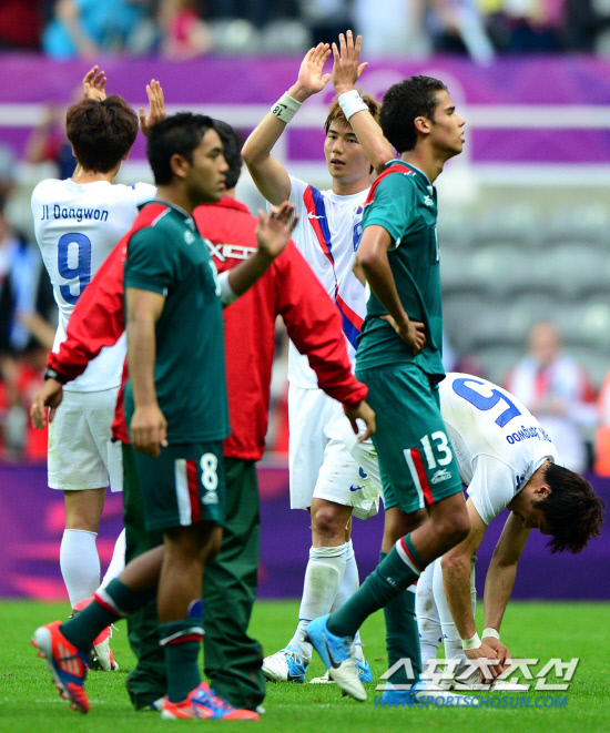 대한민국이 26일 오후 영국 뉴캐슬 세인트제임스파크 스타디움에서 멕시코를 상대로 런던올림픽 남자축구 B조 1차전을 펼쳤다. 멕시코와 0대0 무승부를 기록했다. 경기 종료 후 관중들에게 인사를 하고 있는 선수들.