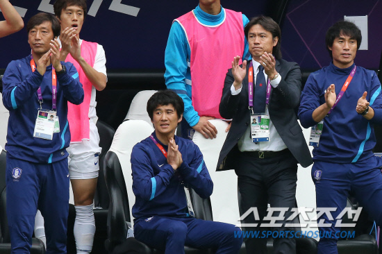 26일 오후(현지시간) 영국 뉴캐슬 세인트 제임스 파크에서 열린 런던 올림픽 축구 남자B조 조별예선 대한민국 대 멕시코 경기에서 홍명보 감독이 선수들에게 박수를 보내며 격려하고 있다. 20120726 뉴캐슬=올림픽사진공동취재단m