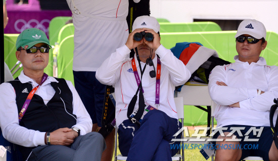 26일 오전(현지시간) 2012런던올림픽에 출전하는 한국 양궁 남자 국가대표팀이 런던 로즈 크리켓 그라운드 연습장에서 훈련을 하고 있는 가운데 코치진들이 선수들의 훈련을 지켜보고 있다.20120726런던=올림픽사진공동취재단L