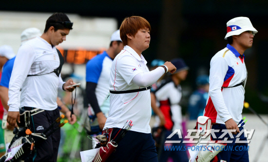 2012런던올림픽에 출전하는 양궁 남자 국가대표 선수들이 런던 로즈 크리켓 그라운드에서 랭킹전을 갖고 있다. 금메달을 향해 첫 출발을 하는 양궁 남자대표팀 김법민(가운데)이 과녁을 향해 걸어가고 있다.
