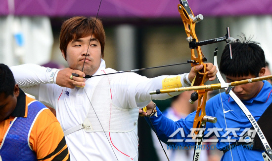 2012런던올림픽에 출전하는 양궁 남자 국가대표 선수들이 런던 로즈 크리켓 그라운드에서 랭킹전을 갖고 있다. 금메달을 향해 첫 출발을 하는 양궁 남자대표팀 임동현이 시위를 당기고 있다.