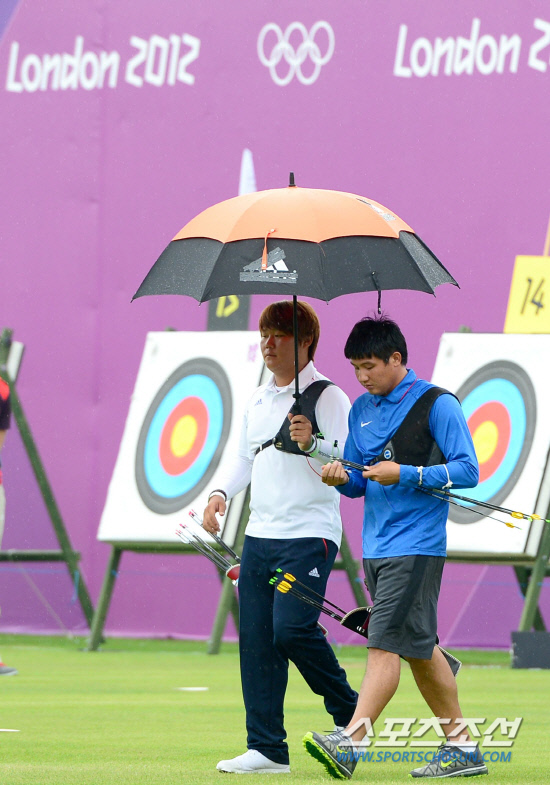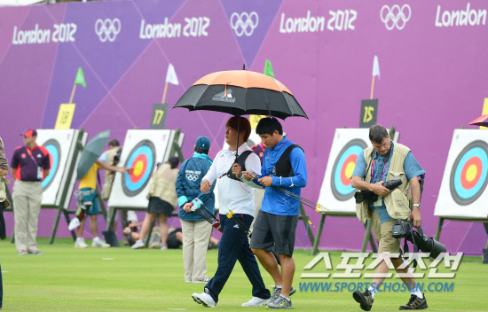 2012런던올림픽에 출전하는 양궁 남자 국가대표 선수들이 런던 로즈 크리켓 그라운드에서 랭킹전을 갖고 있다. 금메달을 향해 순항중인 양궁 남자대표팀 김법민(왼쪽)이 과녁의 성적을 확인하고 발걸음을 돌리고 있다.