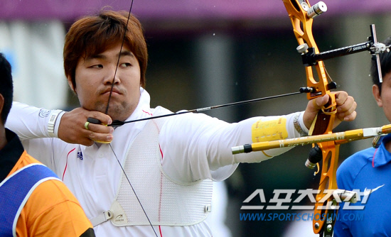 | 2012런던올림픽에 출전하는 양궁 남자 국가대표 선수들이 런던 로즈 크리켓 그라운드에서 랭킹전을 갖고 있다. 금메달을 향해 순항중인 양궁 남자대표팀 임동현이 금빛 과녁을 향해 활시위를 당기고 있다. 런던=올림픽사진공동취재단 |