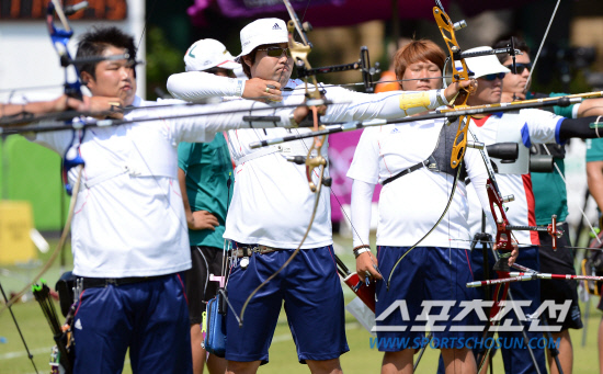 | 26일 오전(현지시간) 2012런던올림픽에 출전하는 한국 양궁 남자 국가대표 오진혁,임동현,김법민이 런던 로즈 크리켓 그라운드 연습장에서 훈련을 하고 있다. 런던=올림픽사진공동취재단 |