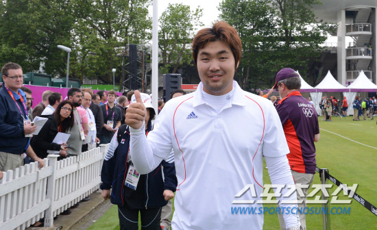 27일(현지시간) 런던 로즈 크리켓 가든 보조경기장에서 열린 예선에서 한국의 임동현 선수가 세계기록을 작성한뒤 엄지손가락을 들어보이고 있다. 20120727런던=올림픽사진공동취재단 g