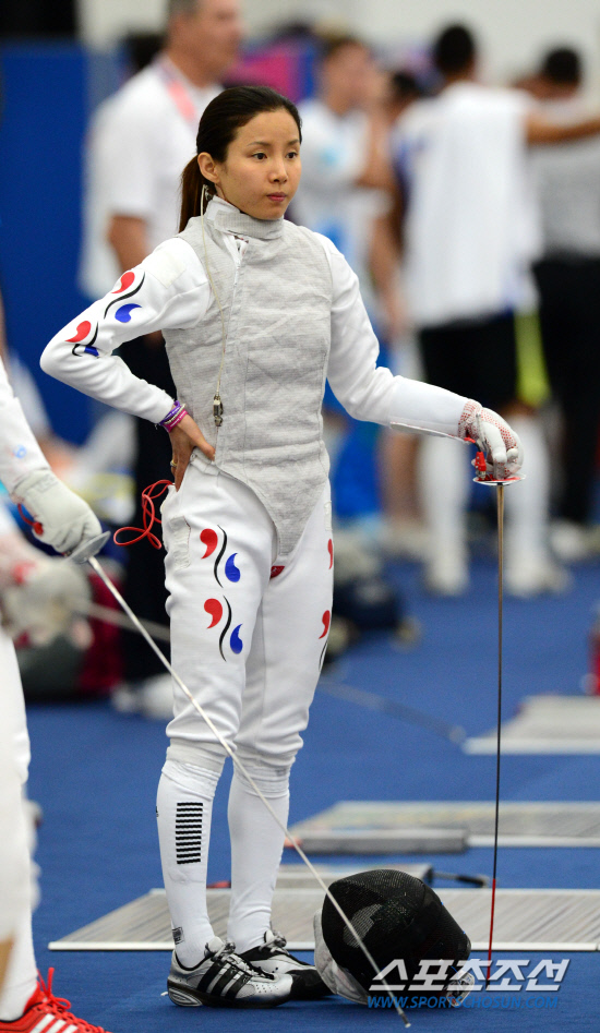 한국 여자 펜싱 사상 첫 금메달에 도전하는 남현희가 27일 오전(현지시간) 런던 엑셀(Excel) 경기장에서 훈련 도중 생각에 잠겨 있다.