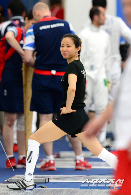 한국 여자 펜싱 사상 첫 금메달에 도전하는 남현희가 27일 오전(현지시간) 런던 엑셀(Excel) 경기장에서 훈련에 앞서 몸을 풀고 있다.