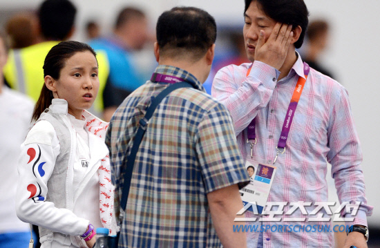 2008 베이징올림픽 은메달 리스트인 한국 펜싱 국가대표 남희 선수가 27일 오전(현지시간) 영국 런던 엑셀경기장에서 훈련중 코치진과 의견을 나누고 있다.20120727런던=올림픽사진공동취재단L
