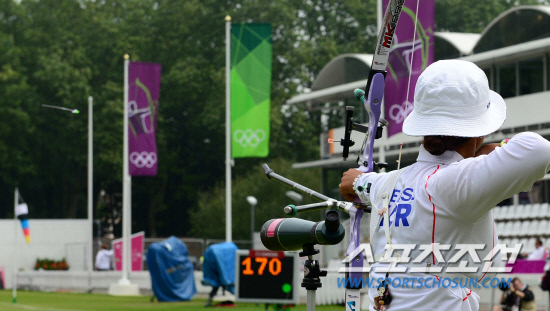 '여자양궁 단체전 올림픽 7연패 도전!' 2012런던올림픽에 출전하는 여자양궁 국가대표 선수들이 27일 런던 로즈 크리켓 그라운드에서 랭킹라운드를 펼쳤다. 이성진, 최현주, 기보배 3명은 개인전과 단체전 금메달에 도전한다. 이성진이 힘차게 활시위를 당기고 있다.