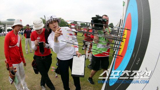 27일 오후(현지시간) 2012 런던올림픽에 출전하는 한국 양궁 여자 국가대표팀 기보배선수가 런던 로즈 크리켓 그라운드에서 랭킹라운드를 랭킹전 마친 후 화살을 체크하고 있다.20120726 런던=올림픽사진공동취재단 i