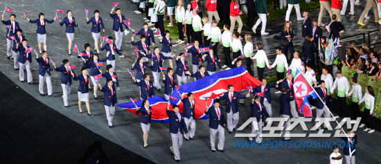 지구촌 최대 스포츠축제인 제30회 런던하계올림픽이 27일 오후 9시(현지시간) 런던 북동부 올림픽스타디움에서 화려한 막이 올랐다. 북한선수들이 여자축구경기 선수소개 화면에 태극기와 바뀌어 소개된 데 대해 항의라도 하듯 대형 인공기를 펼쳐들고 입장하고 있다.