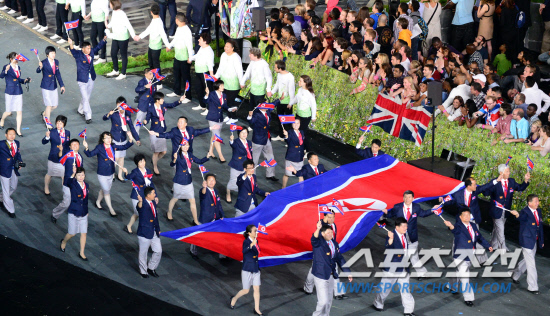 지구촌 최대 스포츠축제인 제30회 런던하계올림픽이 27일 오후 9시(현지시간) 런던 북동부 올림픽스타디움에서 화려한 막이 올랐다. 북한선수들이 여자축구경기 선수소개 화면에 태극기와 바뀌어 소개된 데 대해 항의라도 하듯 대형 인공기를 펼쳐들고 입장하고 있다.
