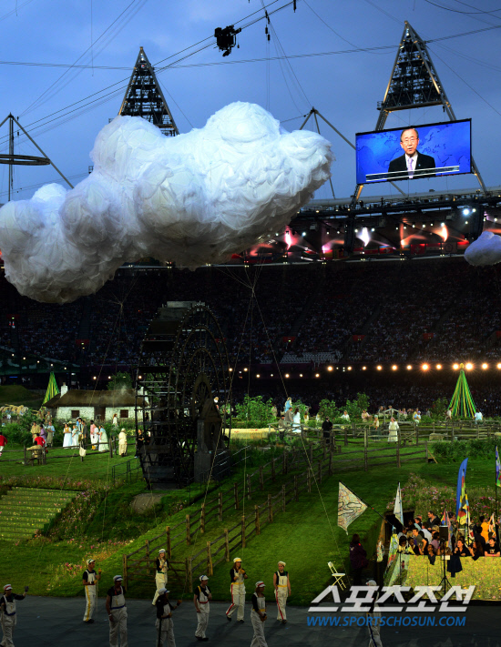 2012 런던올림픽의 개막식이 28일(현지시간) 올림픽파크 메인스타디움에서 화려한 막을 올린 가운데, 반기문 유엔 사무총장이 스타디움 스크린의 영상 메시지를 통해 축하의 인삿말을 전하고 있다.