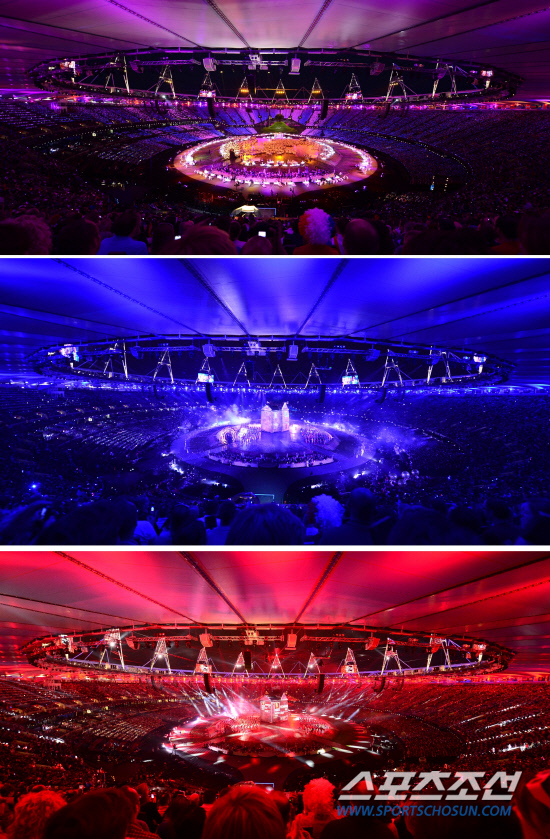 공연주제가 바뀔때마다 경기장 전체가 화려한 조명으로 변신하고 있다. 20120727. 런던=올림픽사진공동취재단e