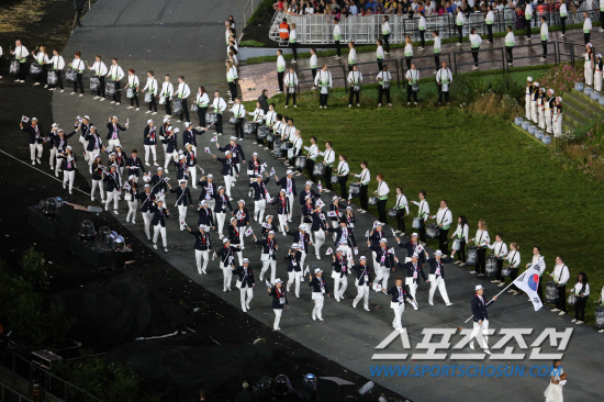 런던 올림픽이 17일 동안의 열전을 시작했다. 대한민국 선수단이 태극기를 흔들며 27일 밤 영국 런던 스트라트포드 올림픽스타디움에 100번째로 들어오고 있다.