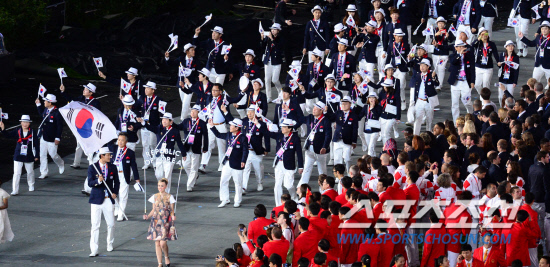 지구촌 최대 스포츠축제인 제30회 런던하계올림픽이 27일 오후 9시(현지시간) 런던 북동부 올림픽스타디움에서 화려한 막이 올랐다. 사전식전행사가 끝난 후 대한민국 선수단이 태극기를 앞세우고 입장하고 있다. 20120727. 런던=올림픽사진공동취재단e