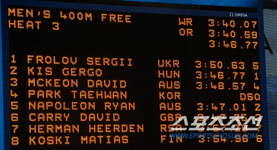 박태환이 28일 런던올림픽파크 아쿠아틱센터에서 열린 400m 예선전 경기에 출전했다. 박태환은 예선 3조 4번 레인에서 경기를 마쳤으나 공식기록에서 실격 처리 됐다. 전광판에 박태환의 실격을 알리고 있다.