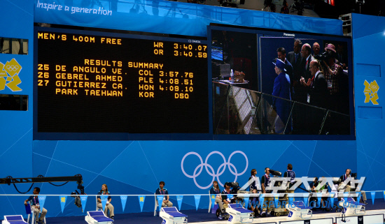 박태환이 28일 런던올림픽파크 아쿠아틱센터에서 열린 400m 예선전 경기에 출전했다. 박태환은 예선 3조 4번 레인에서 경기를 마쳤으나 공식기록에서 실격 처리 됐다. 전광판에 박태환의 실격을 알리고 있다.