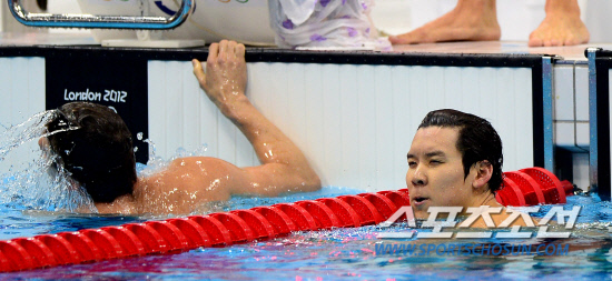 박태환이 28일 런던올림픽파크 아쿠아틱센터에서 열린 400m 예선전 경기에 출전했다. 박태환은 예선 3조 4번 레인에서 경기를 마쳤으나 공식기록에서 실격 처리 됐다. 경기를 마치고 실격이 표시되자 망연자실한 표정을 짓고 있는 박태환.