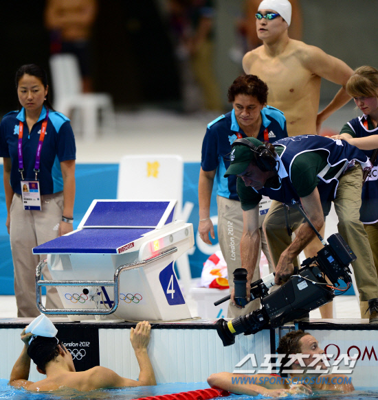 박태환이 28일 런던올림픽파크 아쿠아틱센터에서 열린 400m 예선전 경기에 출전했다. 박태환은 예선 3조 4번 레인에서 경기를 마쳤으나 공식기록에서 실격 처리 됐다. 경기를 마친 박태환(왼쪽)과 기록판을 바라보고 있는 쑨양(오른쪽 상단).
