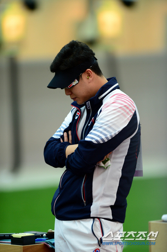한국 사격의 간판 진종오(33·KT)가 28일 오후(현지시간) 영국 런던 그리니치파크 왕립 포병대 기지 사격장에서 열린 남자 10m 공기권총 예선에서 사격도중 마음을 안정시키고 있다. 이날 진종오는 1위로 결승에 진출했다.