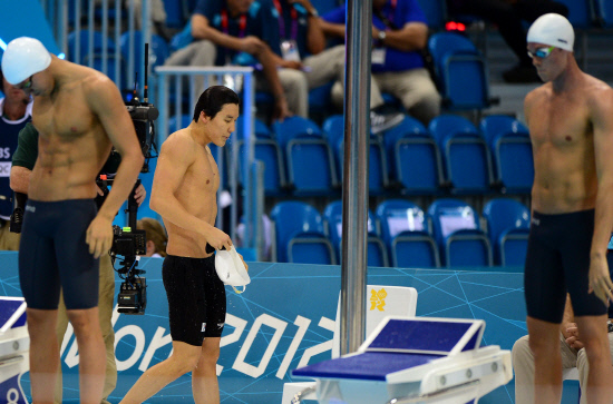 박태환이 28일 런던올림픽파크 아쿠아틱센터에서 열린 400m 예선전 경기에 출전했다. 박태환은 예선 3조 4번 레인에서 경기를 마쳤으나 공식기록에서 실격 처리 됐다. 공식 발표가 나온 것은 아니지만 문제가 있었던 것으로 보인다. 경기를 마치고 고개를 떨구며 경기장을 나서고 있는 박태환.
