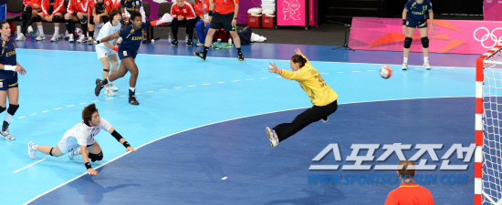 28일 영국 런던 올림픽 파크 핸드볼경기장에서 열린 여자핸드볼 B조 조별예선 한국 대 스페인 경기에서 우리나라의 유은희 선수가 스페인 수비수들을 뚫고 슛을 성공시키고 있다.한국이 31대 27로 승리.
