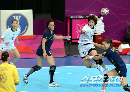28일 영국 런던 올림픽 파크 핸드볼경기장에서 열린 여자핸드볼 B조 조별예선 한국 대 스페인 경기에서 우리나라의 유은희 선수가 스페인 수비수들을 뚫고 슛을 하고 있다.한국이 31대 27로 승리.