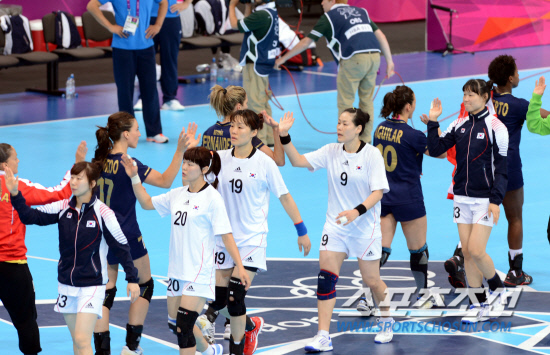 28일 영국 런던 올림픽 파크 핸드볼경기장에서 열린 여자핸드볼 B조 조별예선 한국 대 스페인 경기에서 우리나라가 31대 27로 승리한 뒤 선수들이 서로인사를 나누고 있다