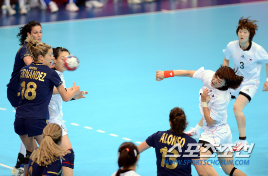 28일 영국 런던 올림픽 파크 핸드볼경기장에서 열린 여자핸드볼 B조 조별예선 한국 대 스페인 경기에서 우리나라의 유은희 선수가 스페인 수비수들을 뚫고 슛을 날리고 있다.한국이 31대 27로 승리.