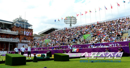 임동현, 김법민, 오진혁으로 구성된 남자 양궁 대표팀이 28일 런던 로즈 크리켓 그라운드 메인 스타디움에서 남자 단체전 경기를 갖었다. 대표팀은 8강전에서 우크라이나에 승리하며 4강에 안착했다. 청명한 날씨 속에 경기가 펼쳐지고 있다.