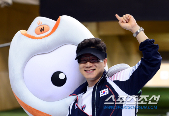 28일 오후 런던 왕립포병대에 위치한 올림픽사격장에서 열린 남자 공기소총 남자 10m 결승에서 우승한 진종오가 런던올림픽 공식마스코트 웬록과 함께 포즈를 취하고 있다. 20120728. 런던=올림픽사진기자단e