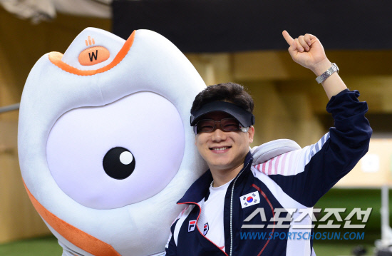 28일 오후 런던 왕립포병대에 위치한 올림픽사격장에서 열린 남자 공기소총 남자 10m 결승에서 우승한 진종오가 런던올림픽 공식마스코트 웬록과 함께 포즈를 취하고 있다. 20120728. 런던=올림픽사진기자단e