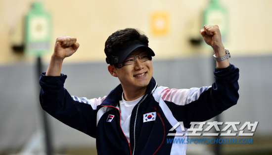 한국 사격의 간판 진종오(33·KT)가 28일 오후(현지시간) 영국 런던 그리니치파크 왕립 포병대 기지 사격장에서 열린 남자 10m 공기권총 결승에서 금메달을 차지한 후 환호하고 있다.