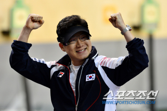 한국 사격의 간판 진종오(33·KT)가 28일 오후(현지시간) 영국 런던 그리니치파크 왕립 포병대 기지 사격장에서 열린 남자 10m 공기권총 결승에서 금메달을 차지한 후 환호하고 있다.