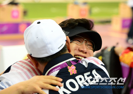 한국 사격의 간판 진종오(33·KT)가 28일 오후(현지시간) 영국 런던 그리니치파크 왕립 포병대 기지 사격장에서 열린 남자 10m 공기권총 결승에서 금메달을 차지한 후 김선일 공기권총 코치와 포옹하며 기뻐하고 있다.