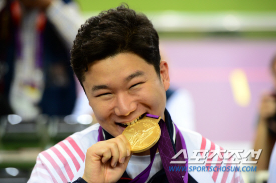 한국 사격의 간판 진종오(33·KT)가 28일 오후(현지시간) 영국 런던 그리니치파크 왕립 포병대 기지 사격장에서 열린 남자 10m 공기권총 결승에서 금메달을 차지한 후 금메달을 깨물고 있다.