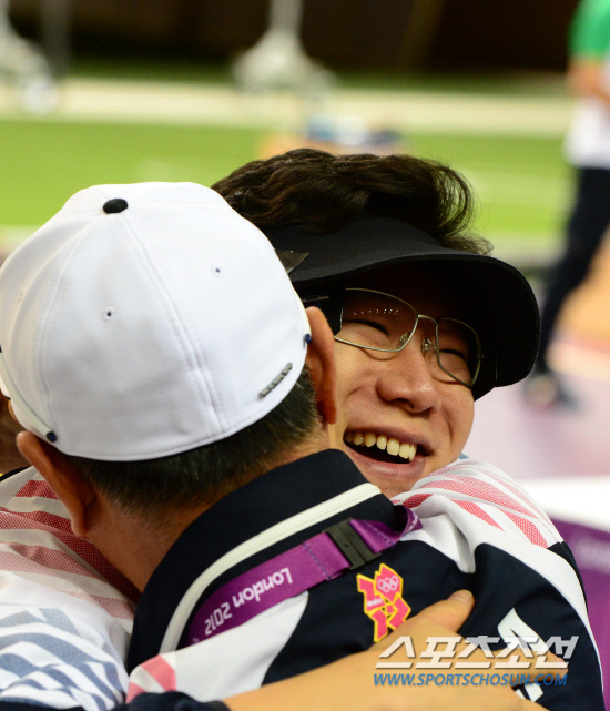 한국 사격의 간판 진종오(33·KT)가 28일 오후(현지시간) 영국 런던 그리니치파크 왕립 포병대 기지 사격장에서 열린 남자 10m 공기권총 결승에서 금메달을 차지한 후 김선일 공기권총 코치와 포옹하며 기뻐하고 있다.