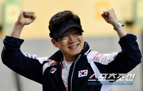 한국 사격의 간판 진종오(33·KT)가 28일 오후(현지시간) 영국 런던 그리니치파크 왕립 포병대 기지 사격장에서 열린 남자 10m 공기권총 결승에서 금메달을 차지한 후 환호하고 있다.