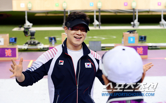 28일 오후 런던 왕립포병대에 위치한 올림픽사격장에서 열린 남자 공기소총 남자 10m 결승에서 우승을 확정한 진종오가 두 팔을 활짝 벌리고 김선일 코치에게 다가서고 있다. 20120728. 런던=올림픽사진기자단e