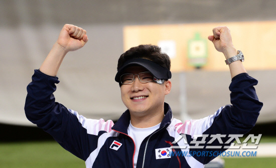 28일 오후 런던 왕립포병대에 위치한 올림픽사격장에서 열린 남자 공기소총 남자 10m 결승에서 우승을 확정한 진종오가 두팔을 치켜 들고 기뻐하고 있다. 20120728. 런던=올림픽사진기자단e