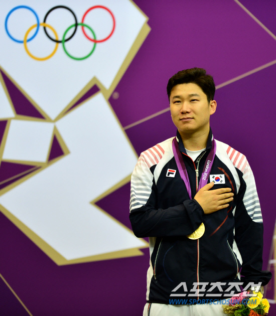 남자 10m 공기권총 결승에서 1위를 차지한 한국 사격의 간판 진종오(33·KT)가 28일 오후(현지시간) 영국 런던 그리니치파크 왕립 포병대 기지 사격장에서 열린 시상식에서 단상에 올라 애국가를 따라 부르고 있다.