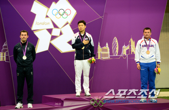 남자 10m 공기권총 결승에서 1위를 차지한 한국 사격의 간판 진종오(33·KT)가 28일 오후(현지시간) 영국 런던 그리니치파크 왕립 포병대 기지 사격장에서 열린 시상식에서 단상에 올라 애국가를 따라 부르고 있다.
