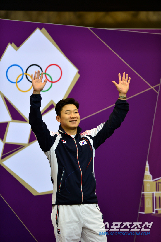 한국 사격의 간판 진종오(33·KT)가 28일 오후(현지시간) 영국 런던 그리니치파크 왕립 포병대 기지 사격장에서 열린 남자 10m 공기권총 결승에서 금메달을 차지한 후 시상대에 올라 손을 들어 인사하고 있다.